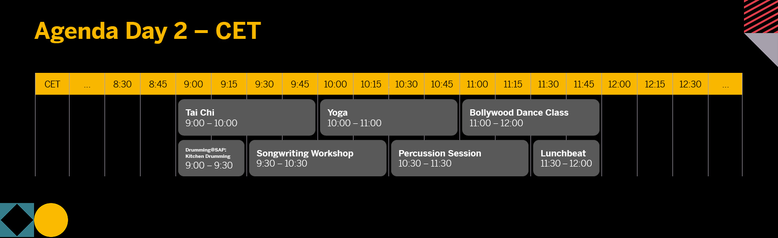 This is exactly one of the major challenges since the beginning of the pandemic. As Sabine Dörken mentions: “You cannot just open a virtual room and expect people to go there and talk to each other.” So the idea came up to instead give each of those “Hang Out Spaces” a theme. There were for example "Activity Channels" for cooking, percussion, yoga or Bollywood dancing with an instructor. But of course, also SAP topics like "Ideation and Creativity" or the question "What will developers do in 2030?".